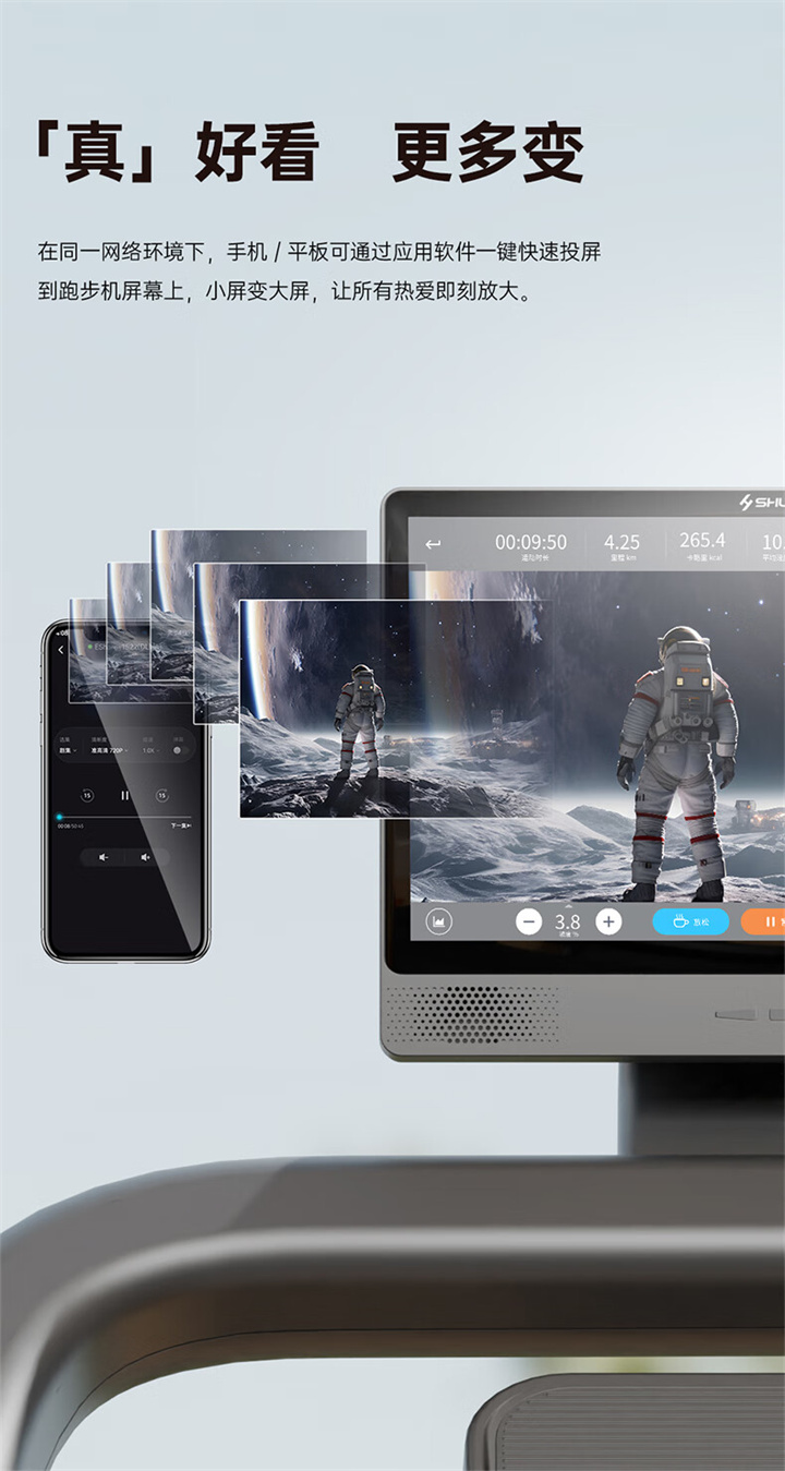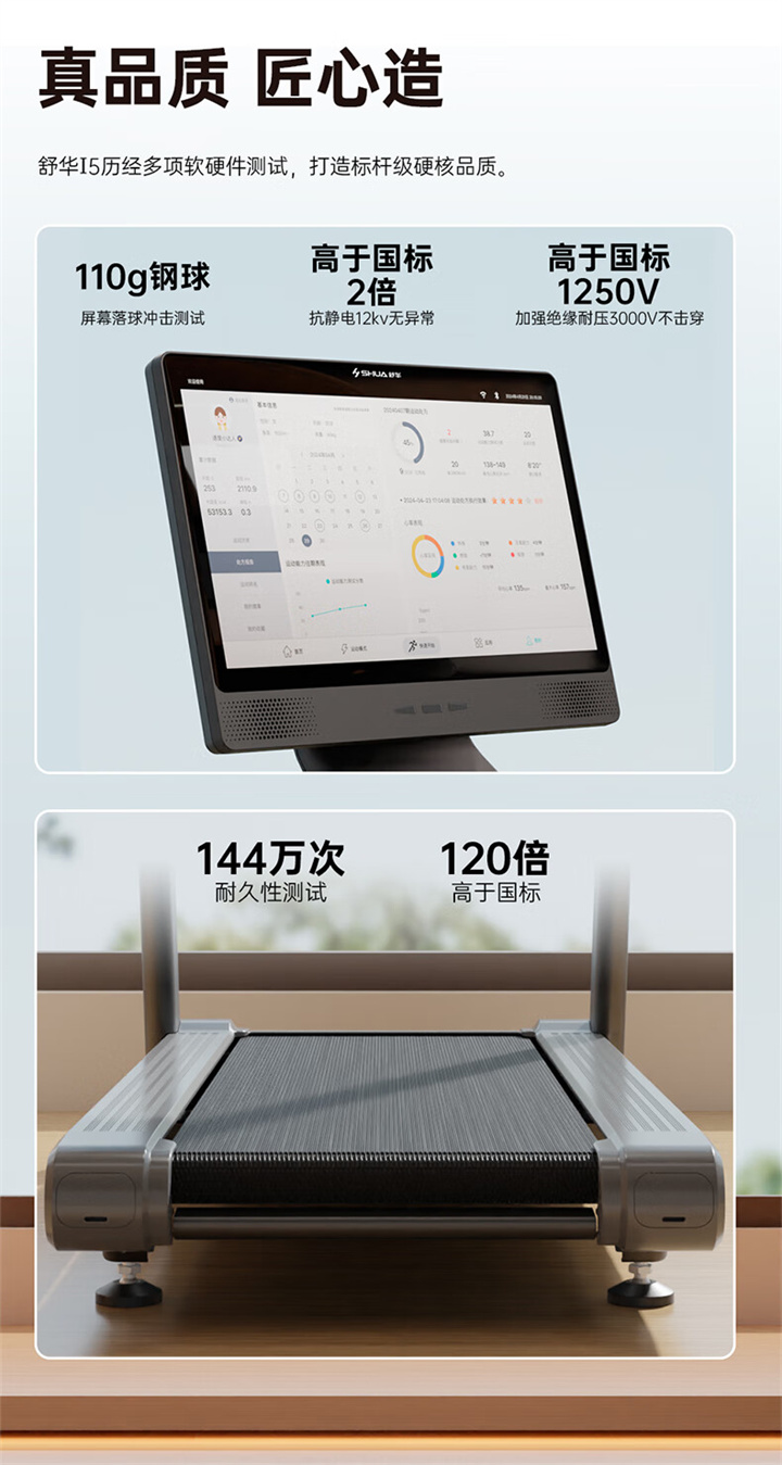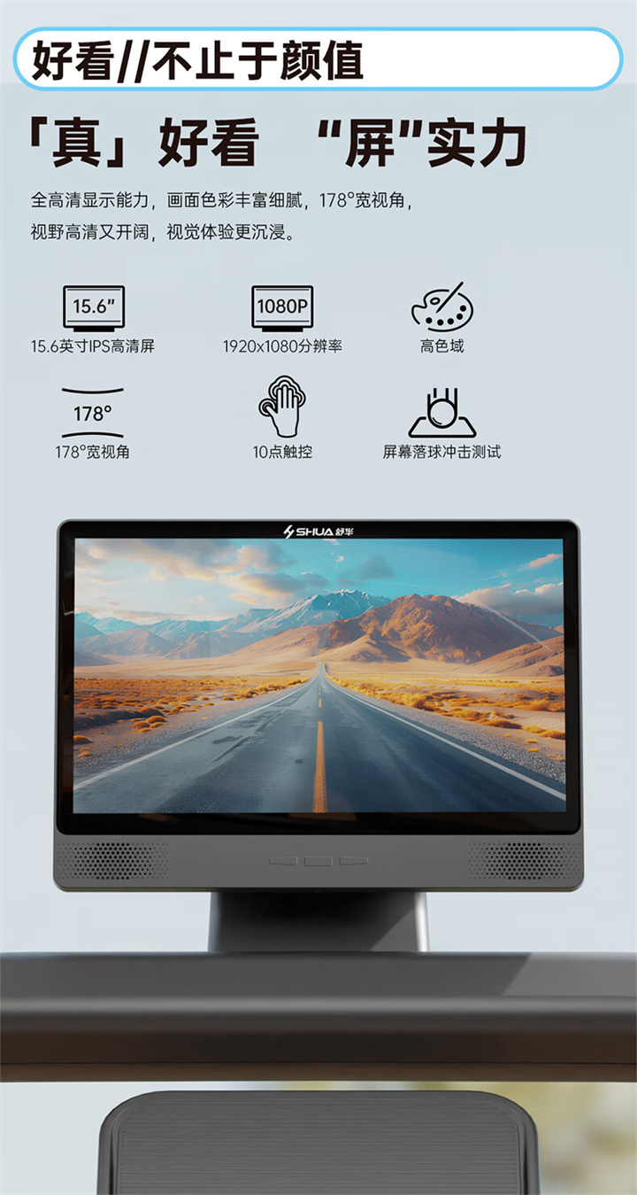 好博体育推荐健身器材-舒华商用电动跑步机SH-T6500拥有10.1寸IPS高清触摸屏、Z型动感时尚外观设计、70×150mm精钢立柱机身、F级高效静音马达、520mm商用豪华跑带和35mm双层全跑台减震跑板等优势,让您享受科学跑步。