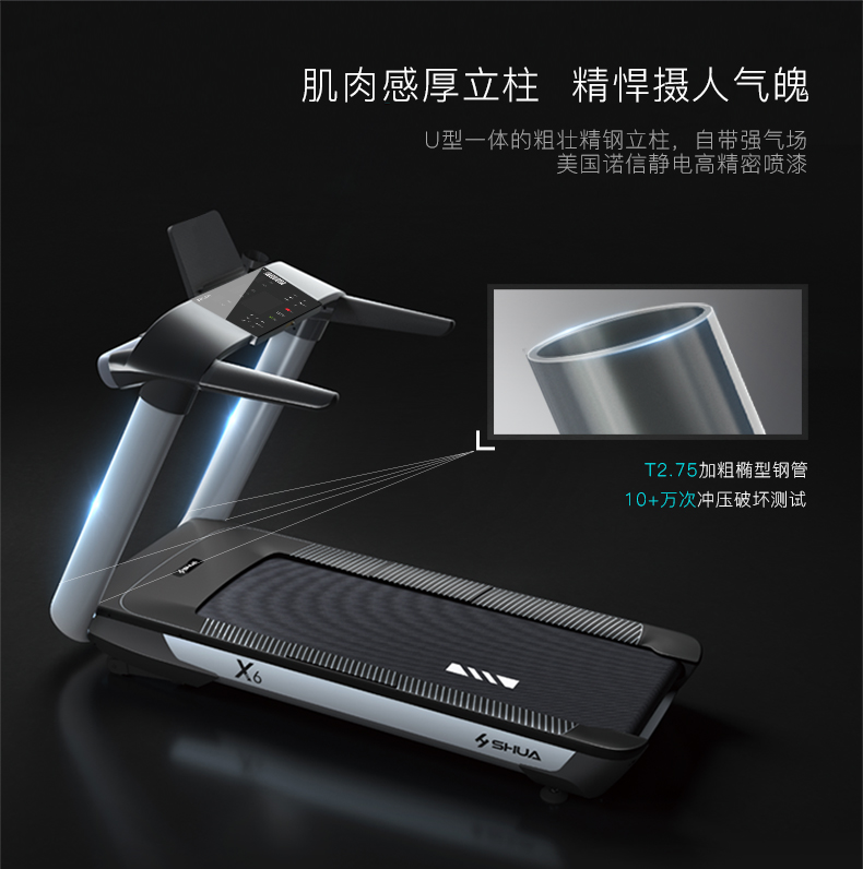 好博体育推荐健身器材-舒华商用电动跑步机SH-T6500拥有10.1寸IPS高清触摸屏、Z型动感时尚外观设计、70×150mm精钢立柱机身、F级高效静音马达、520mm商用豪华跑带和35mm双层全跑台减震跑板等优势,让您享受科学跑步。