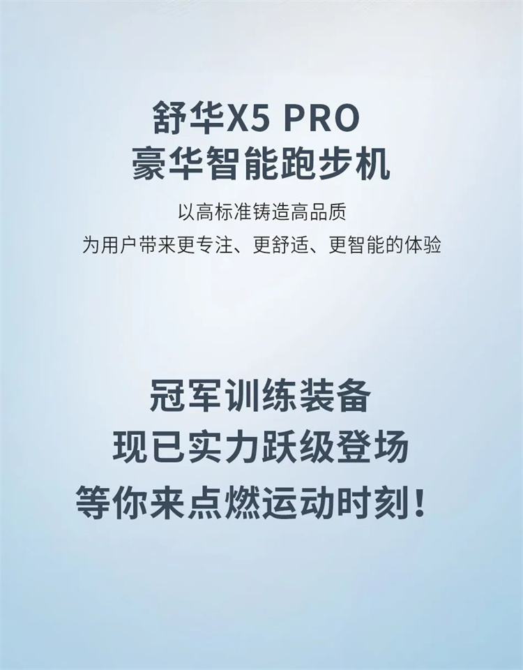 舒华X5 Pro豪华智能跑步机采用全新舒华跑步机系统,搭载21.5寸大屏,内置九种运动程序,包括场景跑、在线约跑和一键体育考试等内容,亦有教练在线科学指导和比赛互动,可在线升级,历经耐久性测试,让您使用更安全,双跑台设计,全减震系统,核心动力采用F级耐高温马达,5.0HP峰值马力,提供源源动力,让您享受每一次畅跑体验。